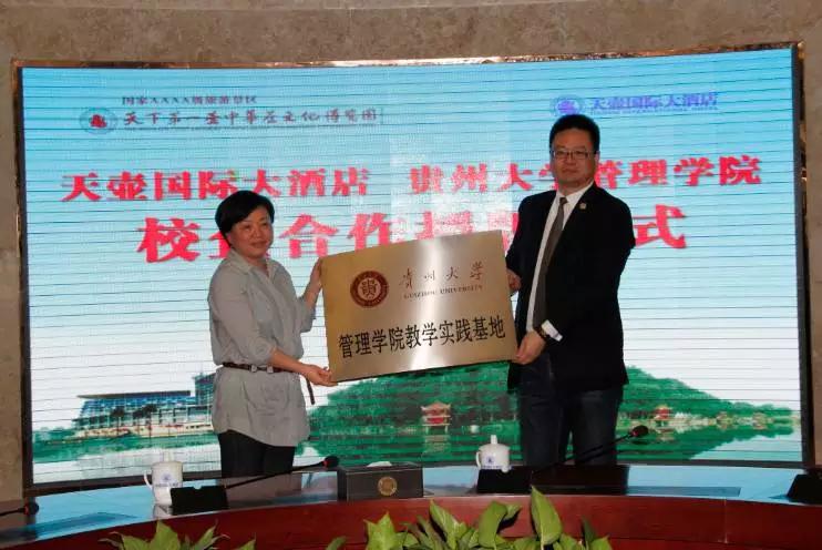 为丰富大学生实践基地资源、促进产学研相结合、强化大学生实践能力,万象城网页版与天壶国际大酒店、天下第一壶茶文化博览园开展校企合作,建立教学实践基地。4月8日,实践基地授牌仪式暨创新创业校外导师聘任仪式在天壶国际大酒店隆重举行。开幕式、授牌仪式由天下第一壶茶文化博览园总经理谭选霞主持,学术交流会由老村长集团董事长陶晓旭主持;万象城网页版党委书记陶玉顺、院长李烨、副院长宋山梅、高登慧教授、高波教授、李毅教授、对外合作办公室主任王云副教授,天壶酒店总经理杜典衡,湄潭县政协经科委科员、中小企业服务中心胡成其主任共同出席。