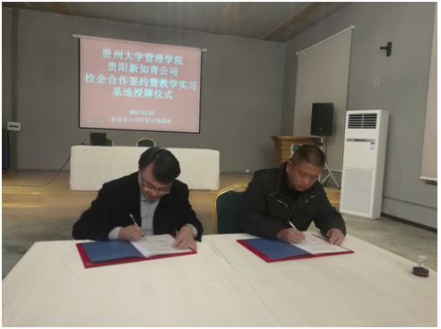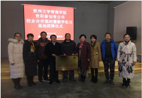 为丰富管理学院学生实践基地资源,促进产学研相结合,强化大学生实践能力, 2017年11月22日,由管理学院院长李烨教授带队,副院长宋山梅教授、对外办公室主任王云副教授、办公室副主任邵美婷、工会副主席王军副教授同行,对贵阳新知青田园生态文化有限责任公司开展实地调研,并与该公司签订了校企合作框架协议及共建实践基地协议,同时举行了实践基地授牌仪式。