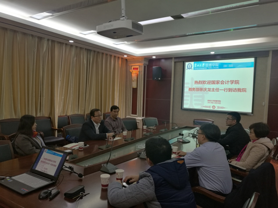 李烨院长向张庆龙主任一行介绍了管理学院,包括管理学院发展历程、发展愿景、发展动态定位、学科专业、教学、师资队伍、学生情况、科研平台、对外交流与合作以及学院发展总体思路等方面情况。张庆龙主任介绍了国家会计学院办学、师资、培训等方面的情况。双方就财会学生培养、财会专业教师进修、会计领军人才培养、案例开发等方面进行了交流,并初步达成进一步合作的意向。