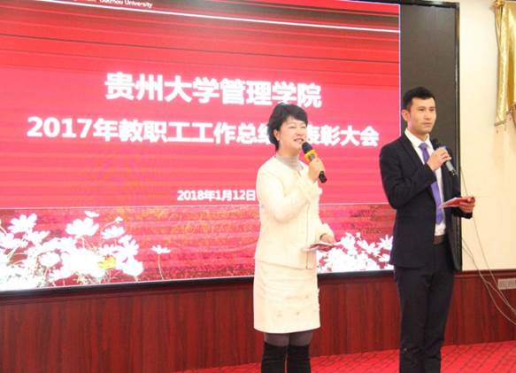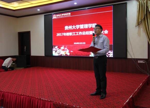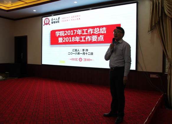 在主持人向大会介绍参会人员之后,李烨院长代表学院党政领导班子向大会做题为《学院2017年工作总结暨2018年工作要点》的报告。李院长表示2017年贵州大学各项事业发展取得新的突破与成就,特别是双一流高校建设和部省共建高校建设,为贵州大学赢得了极大的社会声誉,党的十九大的胜利召开,为贵州大学的发展提供了更为广阔的平台和机遇。学校各项事业的节节高升与全面开花,为管理学院的发展提供了更高水平的平台、更加难得的机遇。在新的机遇和挑战面前,管理学院上下,心往一处想,劲往一处使,2017年学院各项事业取得长足发展,在学校2017年度加快发展目标绩效考核中取得4A1B等次、年度基层万象城网页版考核中取得优秀等次,此外学院2017年重大成就有三项,分别为:一是农林经济管理、管理科学与工程一级学科进入国内一流学科建设行列,并成功申报农林经济管理、管理科学与工程一级学科博士点;二是成功申报贵州大学波罗的海区域研究中心(教育部国别与区域研究中心),并举行贵州大学波罗的海区域研究中心揭牌仪式暨一带一路跨国知识青年创新创业高峰论坛;三是成立贵州大学校友会管理学院分会,并成功举办学院校友分会成立大会暨首届校友企业家创新创业论坛。