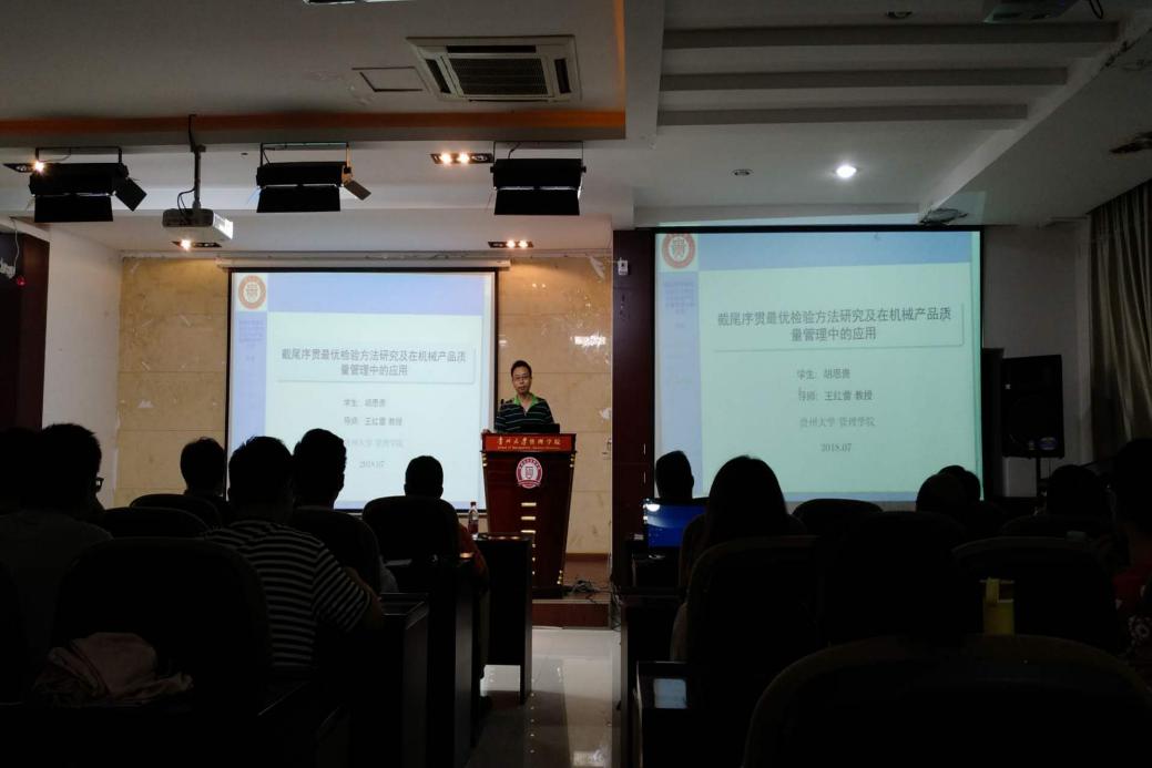 会议由三个学术报告组成。第一位报告人是管理学院博士研究生胡思贵,报告主题为“截尾序贯最优检验方法研究及在机械产品质量管理中的应用”,主要回报了研究背景,研究方法以及自己做出的部分成果。
