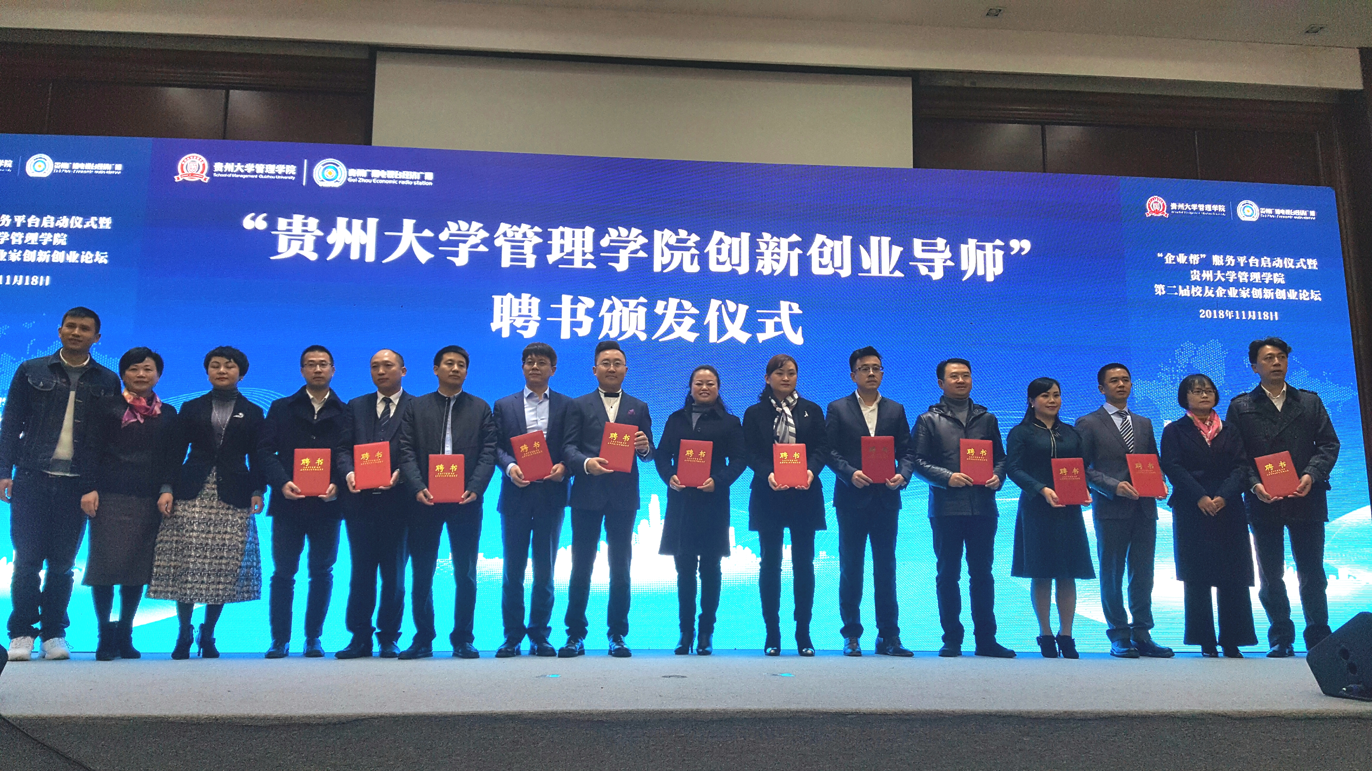 活动当天,还向中国银行贵州省分行副行长李亦岚、贵州广播电视台经济广播总监杨虹、贵州省装饰设计行业协会会长陆春宝、贵州小飞通用航空公司董事长吕小飞、仁怀市青年商会会长、贵州仁怀本味坊酒业党支部书记、董事长唐晖等11位优秀校友企业家代表颁发了“贵州大学管理学院创新创业导师”聘书。