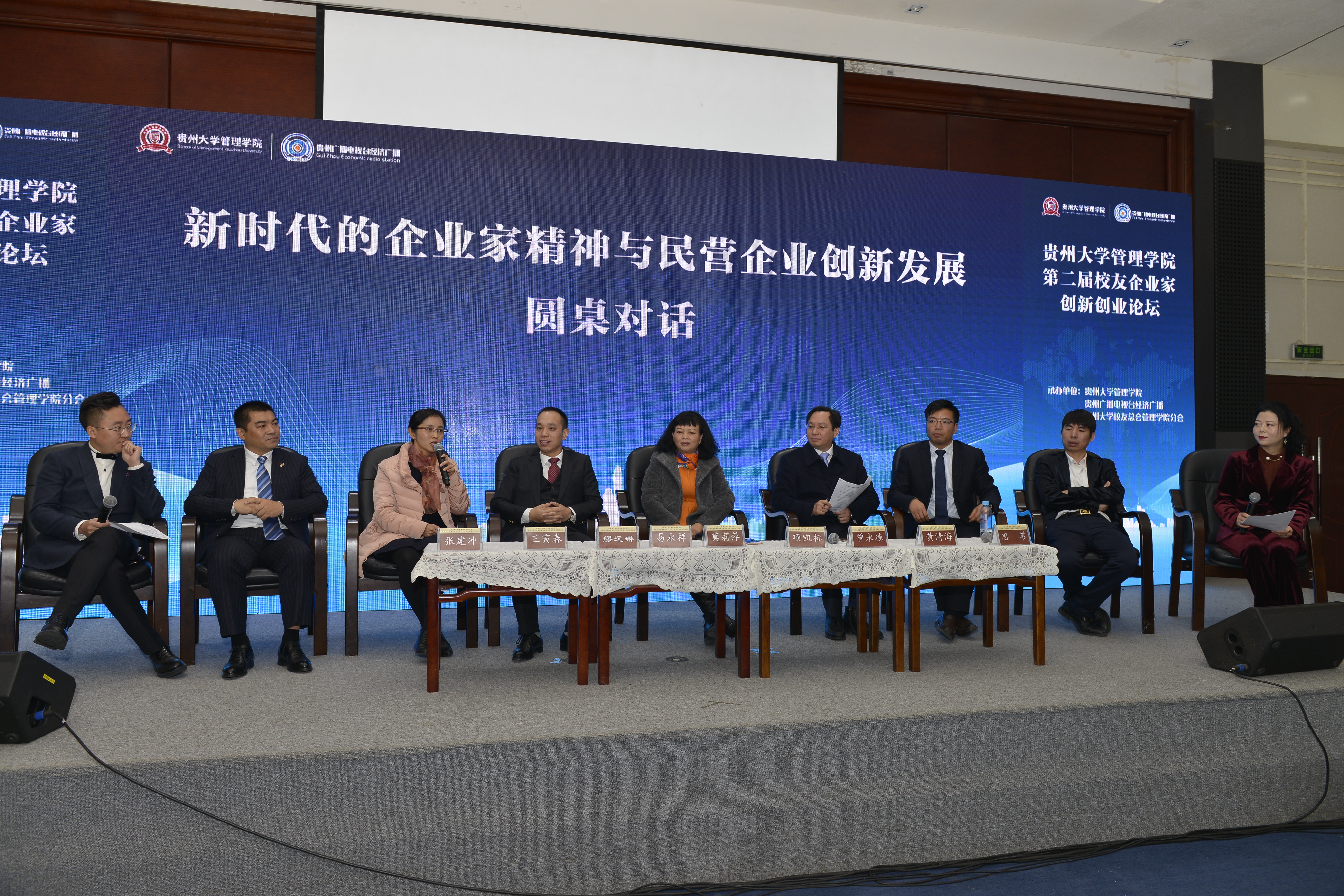 随后,贵州省省管专家、民建贵州省委财政金融委员会主任莫莉萍博士,万象城网页版工商管理系主任项凯标博士、中国银行贵州省分行中小企业部总经理缪远琳以及万象城网页版校友会部分企业家代表,以“新时代的企业家精神与民营企业创新发展”为主题展开思想交锋,分享了各自的观点和看法。
