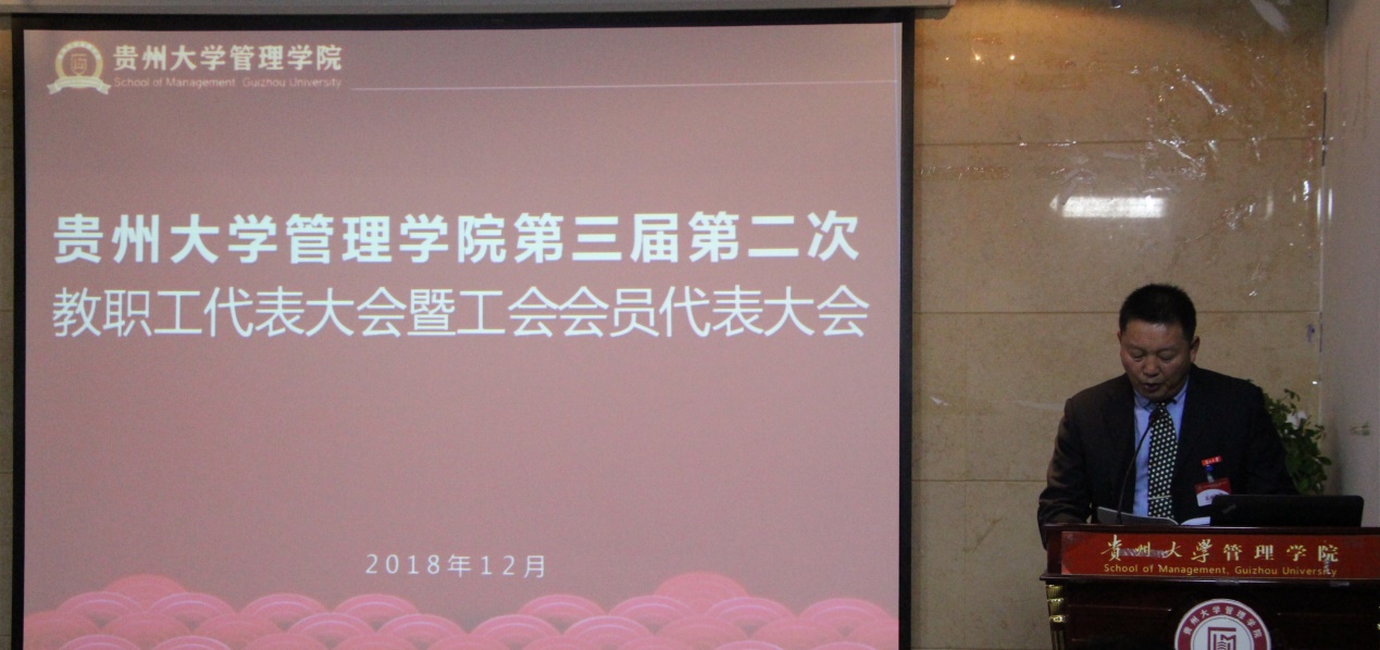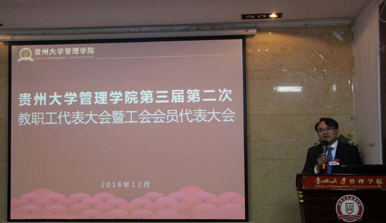 会议在庄严肃穆的国歌声中拉开序幕。学院院长李烨教授首先作院长工作报告,李院长对2018年学院工作进行了全面总结并展望2019年工作目标和任务,还对学院2018年学院经费收支情况作了通报。在对2018年的工作回顾中李院长从坚定社会主义办学方向,全面加强党的建设;加强学科内涵建设,丰富和完善学科体系;注重教学管理,不断提升教学质量;师资队伍建设情况;对外交流与合作;服务地方经济以及深化管理制度改革和健全引才聚才长效机制等7个方面进行总结,肯定了学院2018年工作取得的可喜成绩,但也应该看到学院一级学科博士点建设需进一步加强;师资队伍还需进一步优化和提升;内部管理需进一步细化;对外交流与合作力度需进一步加大以及服务地方经济和社会发展的能力需进一步增强等工作还要加强和提升,不断的推进学院的新发展,迈向新台阶。李院长同时展望了2019年学院的工作计划和任务,从提升教学质量工程建设;推进“双一流”建设工作;加强一级学科博士点建设等方面概括了学院发展的方向。2019年是学院发展的关键之年,机遇与挑战并存,我们应该抓住机遇、团结一心、苦干实干,使管理学院转型升级更上一层台阶。