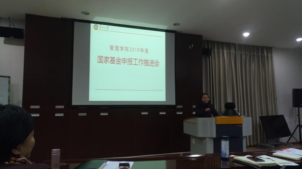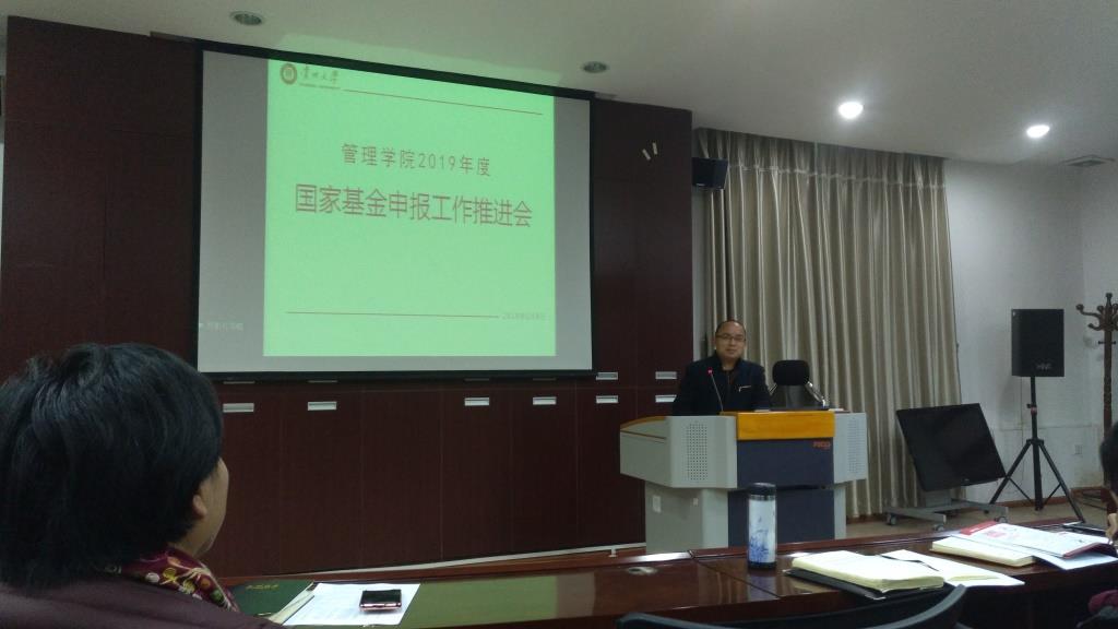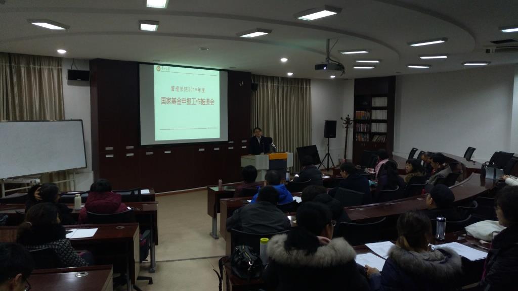 为了落实贵州大学对管理学院下达的2019年申请国家社科基金项目的任务和为完成2019年管理学院的科研目标考核做好准备,我院于2019年1月8日下午3:00在管理学院1楼101室召开“管理学院2019年度国家基金申报工作推进会”。管理学院所有今年没有国家级在研项目的教授、副教授和具有博士学位的教师参加了此次会议,李烨院长主持本次会议。会议分为以下几个议题进行:1、传达学校关于国家社科基金申报工作推进会的会议精神;2、进行2019年度国家项目申报工作部署;3、邀请本院获得国家社科基金立项的教师分享申报经验。
