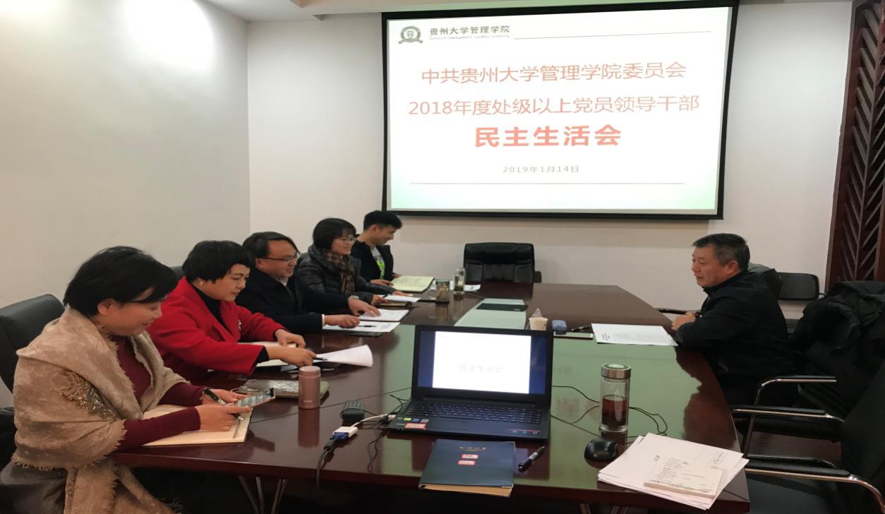 按照《中共贵州大学委员会关于认真开好2018年度处级以上党员领导干部民主生活会的通知》文件精神,管理学院于2019年1月14日下午14:30分在学院三楼小会议室组织召开2018年度处级以上党员干部民主生活会,学校常务副校长王红蕾教授到会指导,学院党政办公室主任陈健同志列席会议,会议由学院院长李烨教授主持。