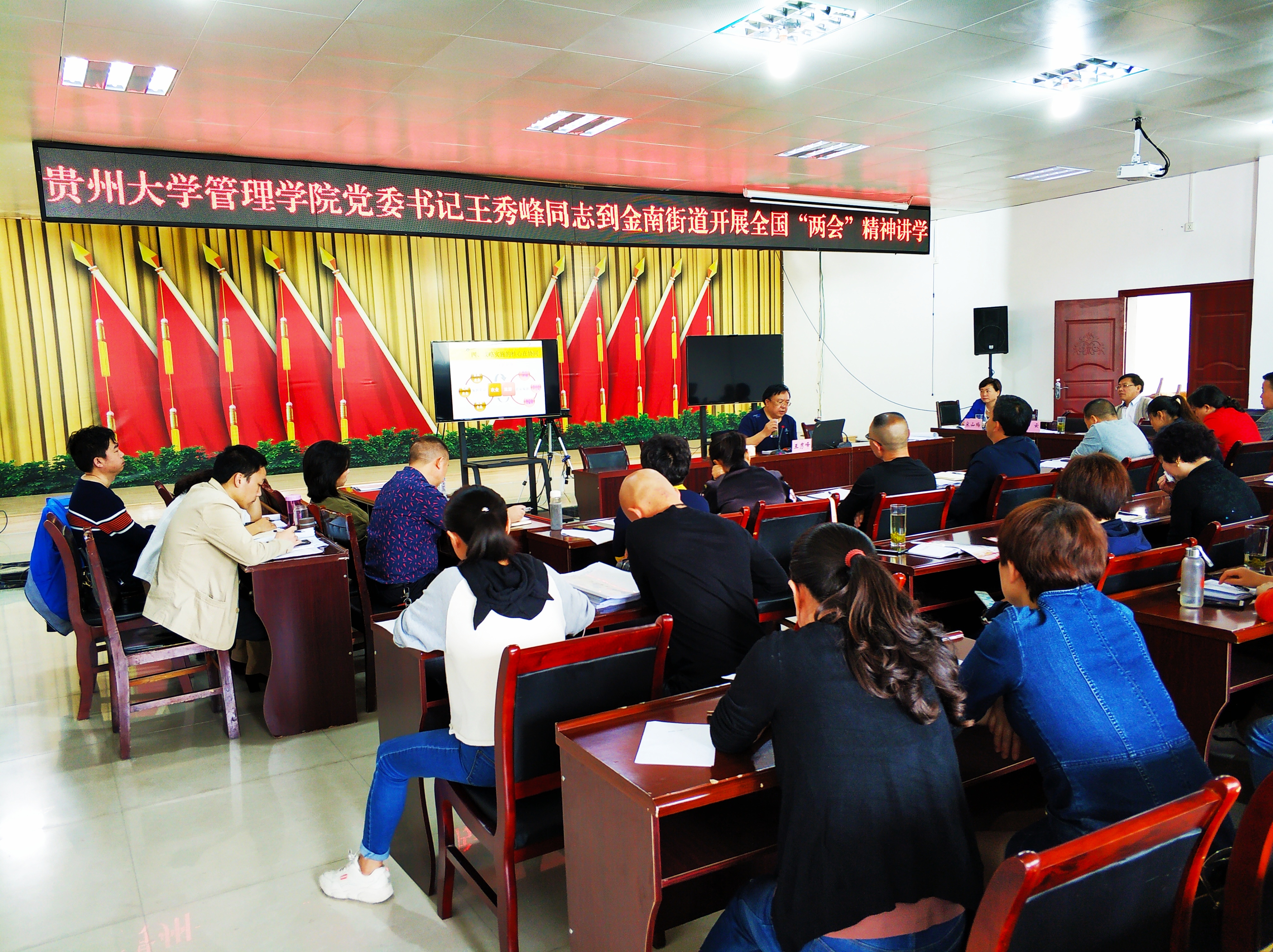 2019年4月20日万象城网页版党委书记王秀峰教授应贵定县金南街道办事处基层党委邀请为贵定县乡镇干部作“发挥优势、抓住机遇、实施乡村振兴战略、打好扶贫攻坚战”的主题讲座,管理学院副院长宋山梅教授、对外合作办公室主任王云副教授及营销系高波教授参加了此次活动。。