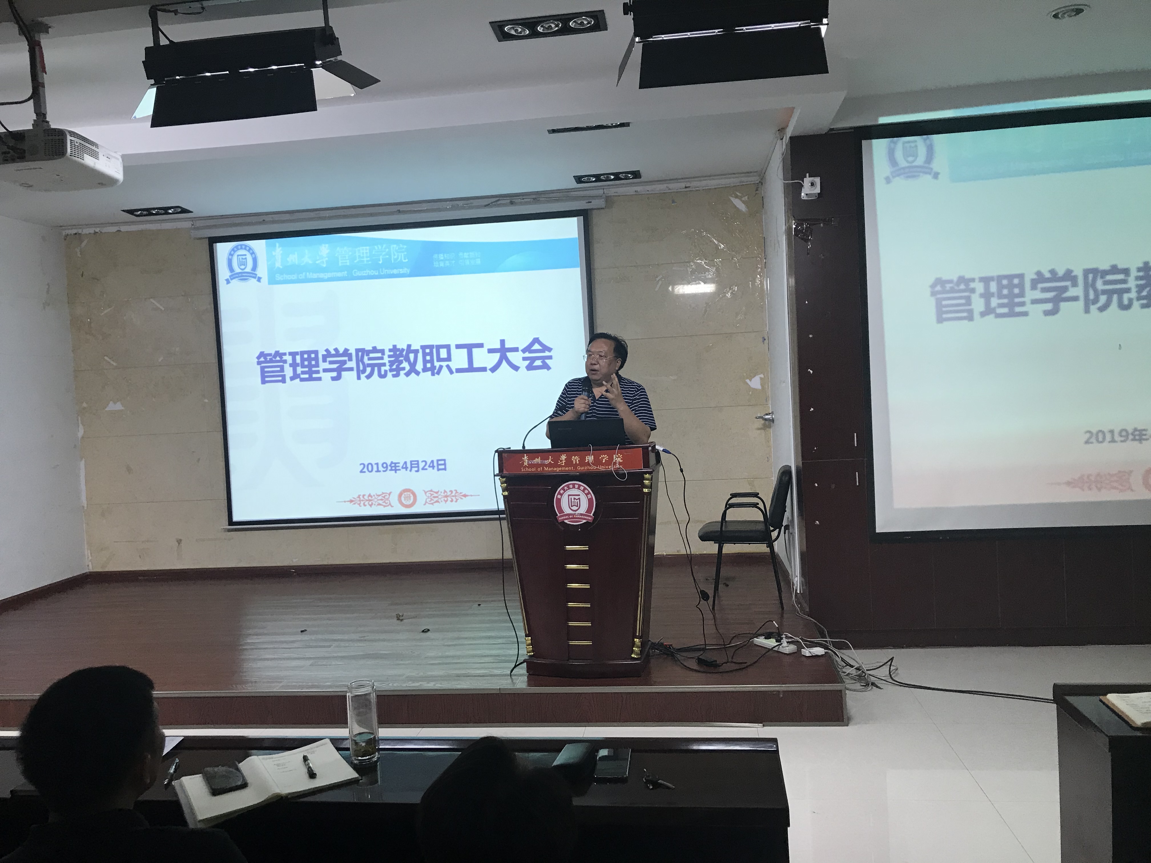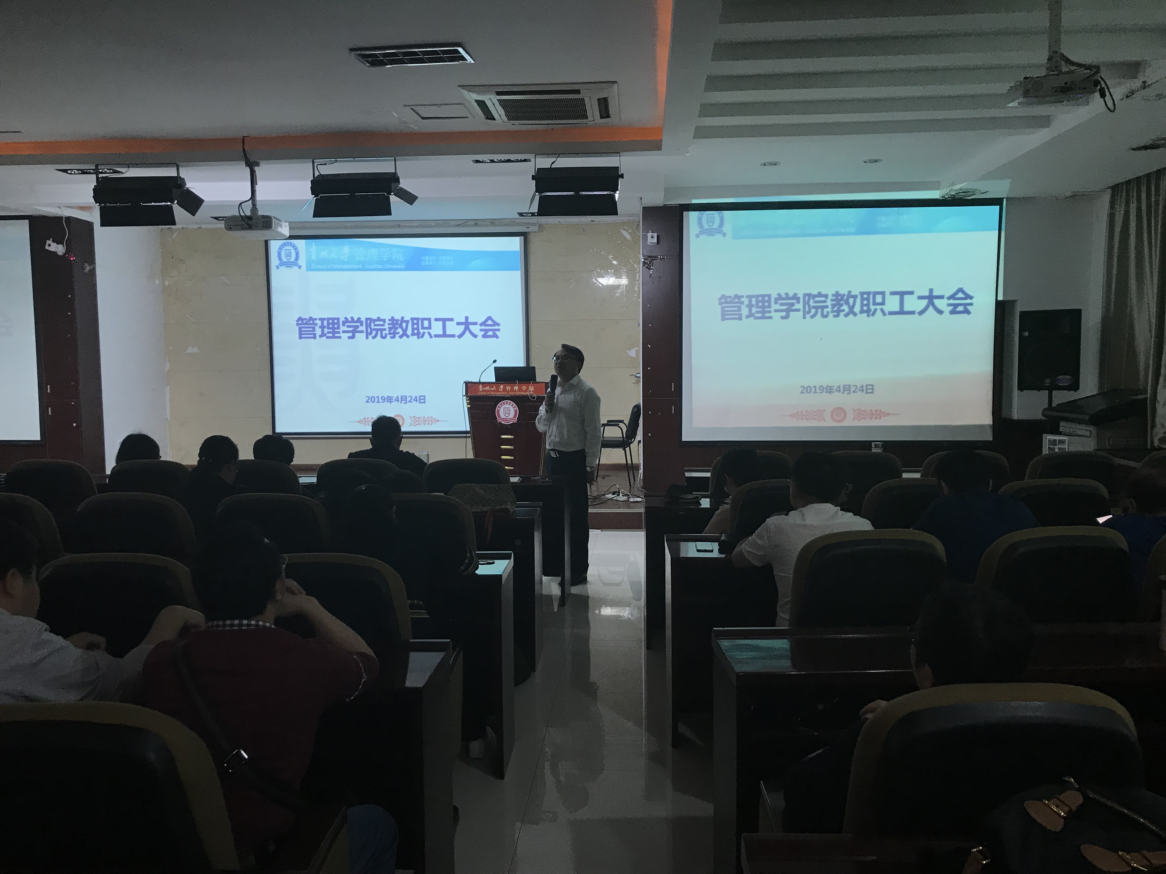2019年4月24日中午13:00,学院在致远楼三楼报告厅召开全院教职工大会。学院领导、教职工参加了会议,会议由李烨院长主持。