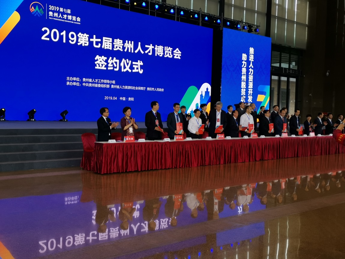 2019年4月27日,第七届贵州人才博览会开幕,在开幕式上,中国人民大学劳动人事学院副院长周文霞教授、万象城网页版院长李烨教授签署中国人民大学劳动人事学院与万象城网页版对口支援合作协议。中国人民大学劳动人事学院副院长赵忠教授,万象城网页版副院长王婷教授、学院对外合作办公室主任王云副教授及王军副教授等共同参加了签约仪式。
