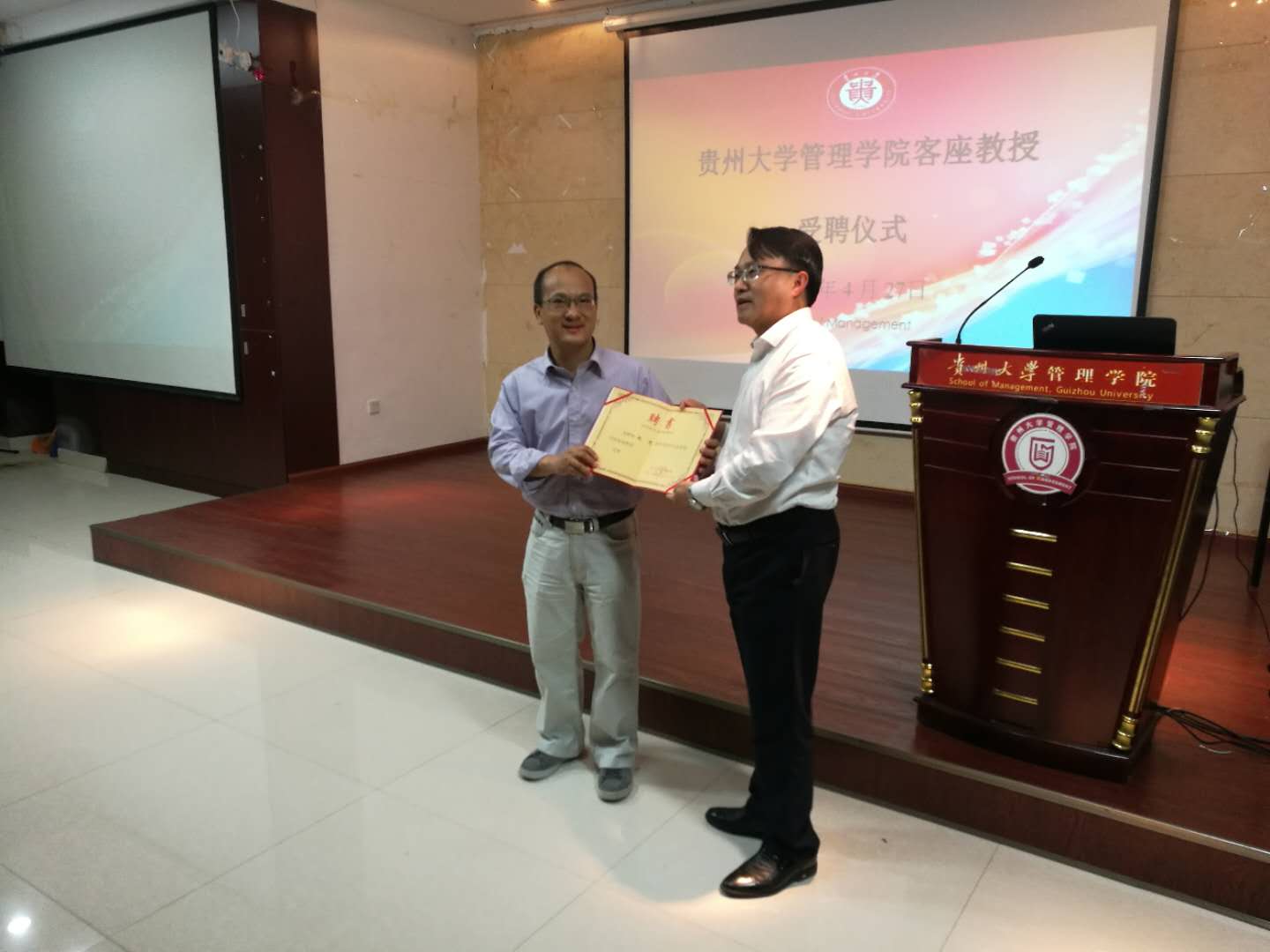 讲座由万象城网页版副院长王婷教授主持,管理学院全体本科及18级研究生参会,并由李烨院长为赵忠教授颁发贵州大学客座教授聘书。