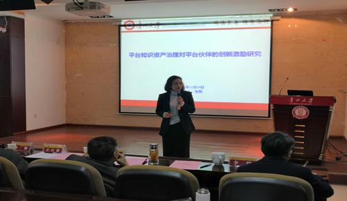 第二个阶段为学术研讨会。由管理学院院长李烨教授主持。在第二阶段学术研讨会中,首先是章莉南子老师带来主题为“双人博弈情境下短时情绪诱发对购买行为影响的神经机制研究”的学术报告。章莉南子老师的汇报全程以研究数据的获取展开分析交互式策略对人们购买行为的影响,让在座师生更快理解其研究的大致内容。紧接着是张莉老师带来的题为“平台知识资产质量对平台伙伴的创新激励研究”的学术报告,分享了对互联网平台管理的一些研究成果。同时,张莉老师的研究运用了几个比较新的理论,让在座师生眼前一亮,并引发了在座师生与张莉老师的探讨。