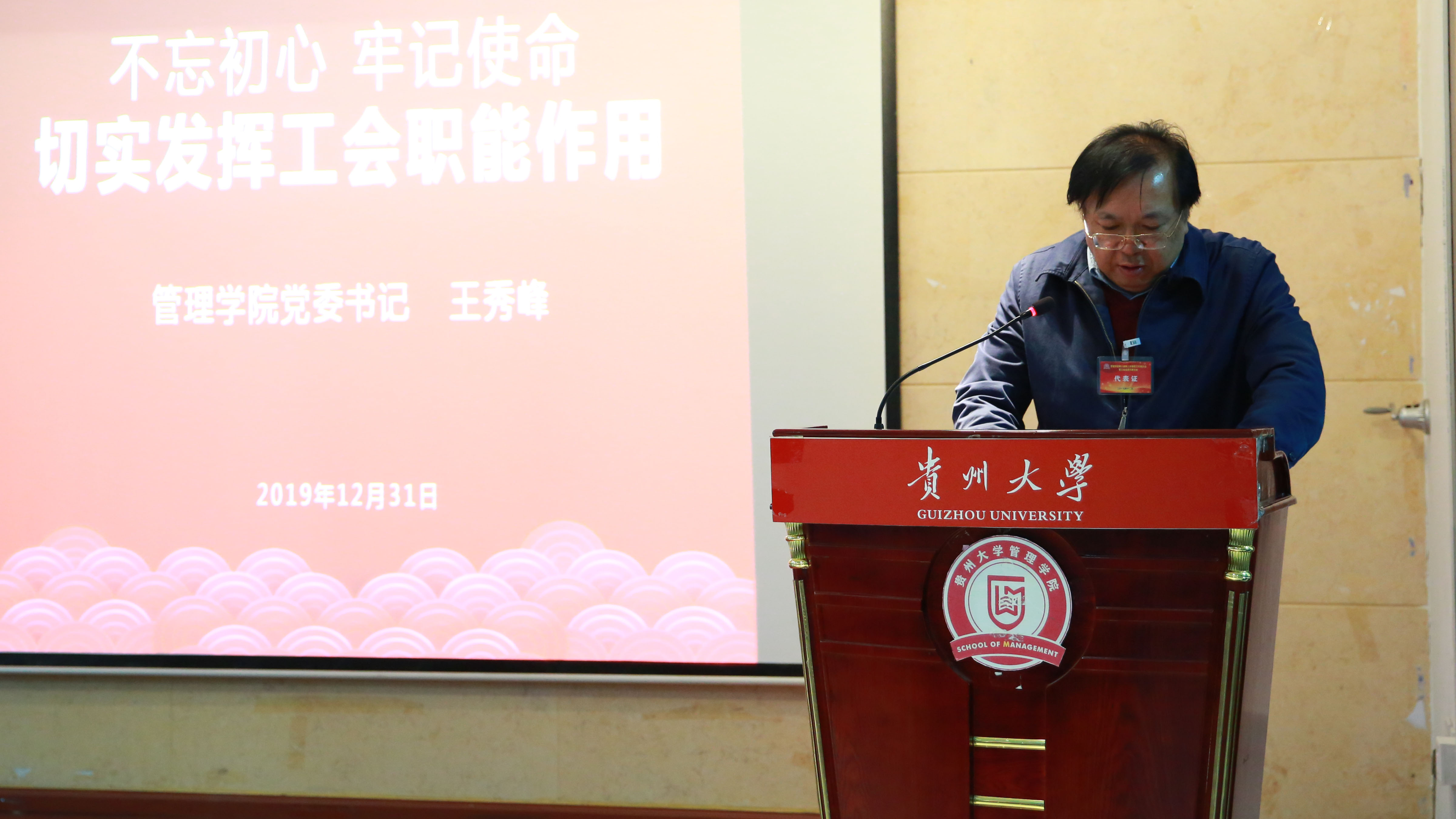 其次,学院党委书记(代分工会主席)王秀峰同志作《不忘初心,牢记使命,切实发挥工会职能作用》的2019年管理学院分工会委员会工作报告,王书记对学院分工会在组织工会活动、参政议政、维护教职工权益、脱贫攻坚,服务地方经济、围绕学院中心工作建设,落实教育实效等方面工作作了全面细致的总结,工作报告彰显了管理学院分工会发扬优良传统,为教职工服务,为学院发展服务,充分发挥桥梁纽带作用,对全院教职工的积极参与和共同努力建设更好的职工之家表示衷心感谢。