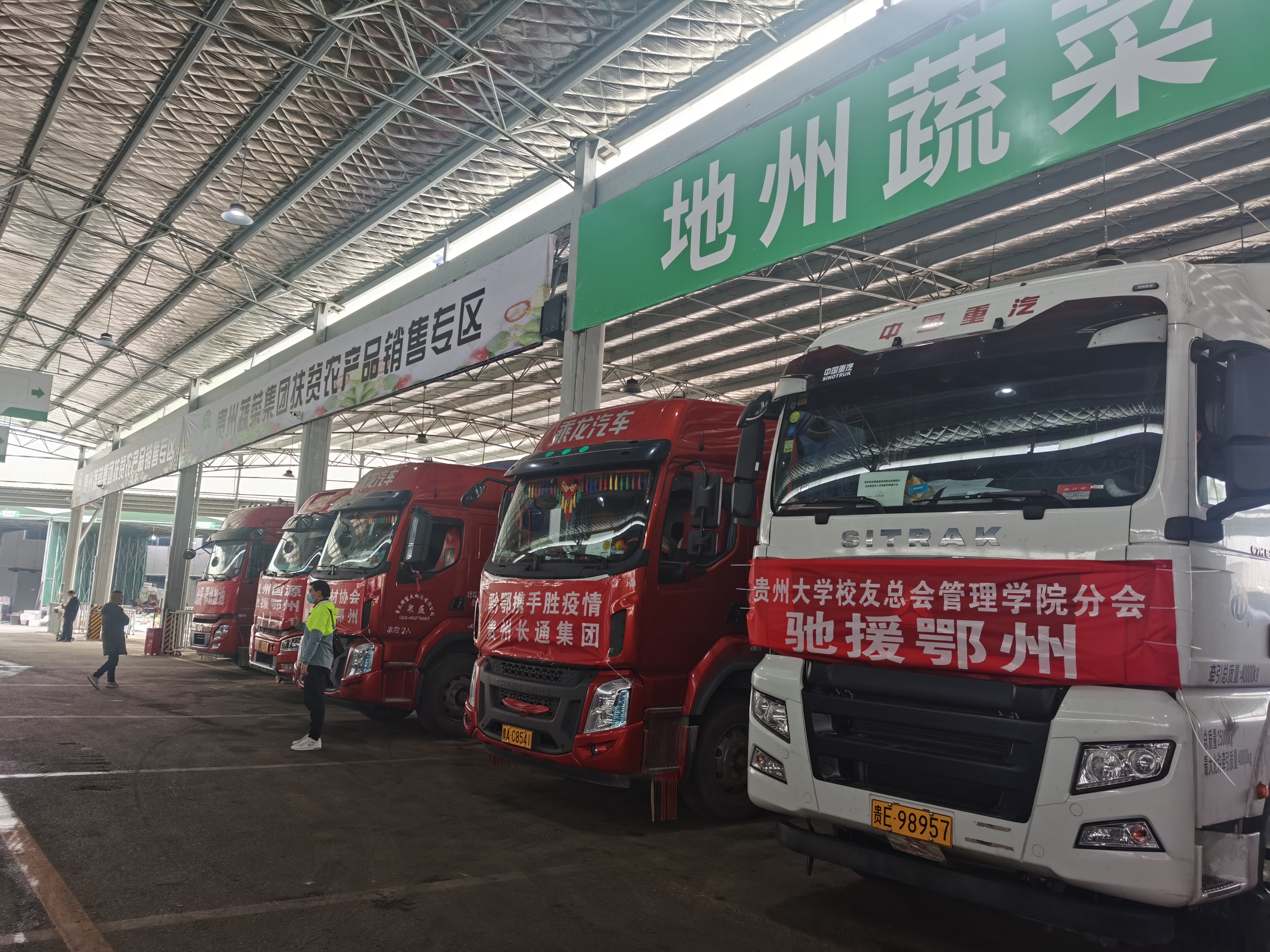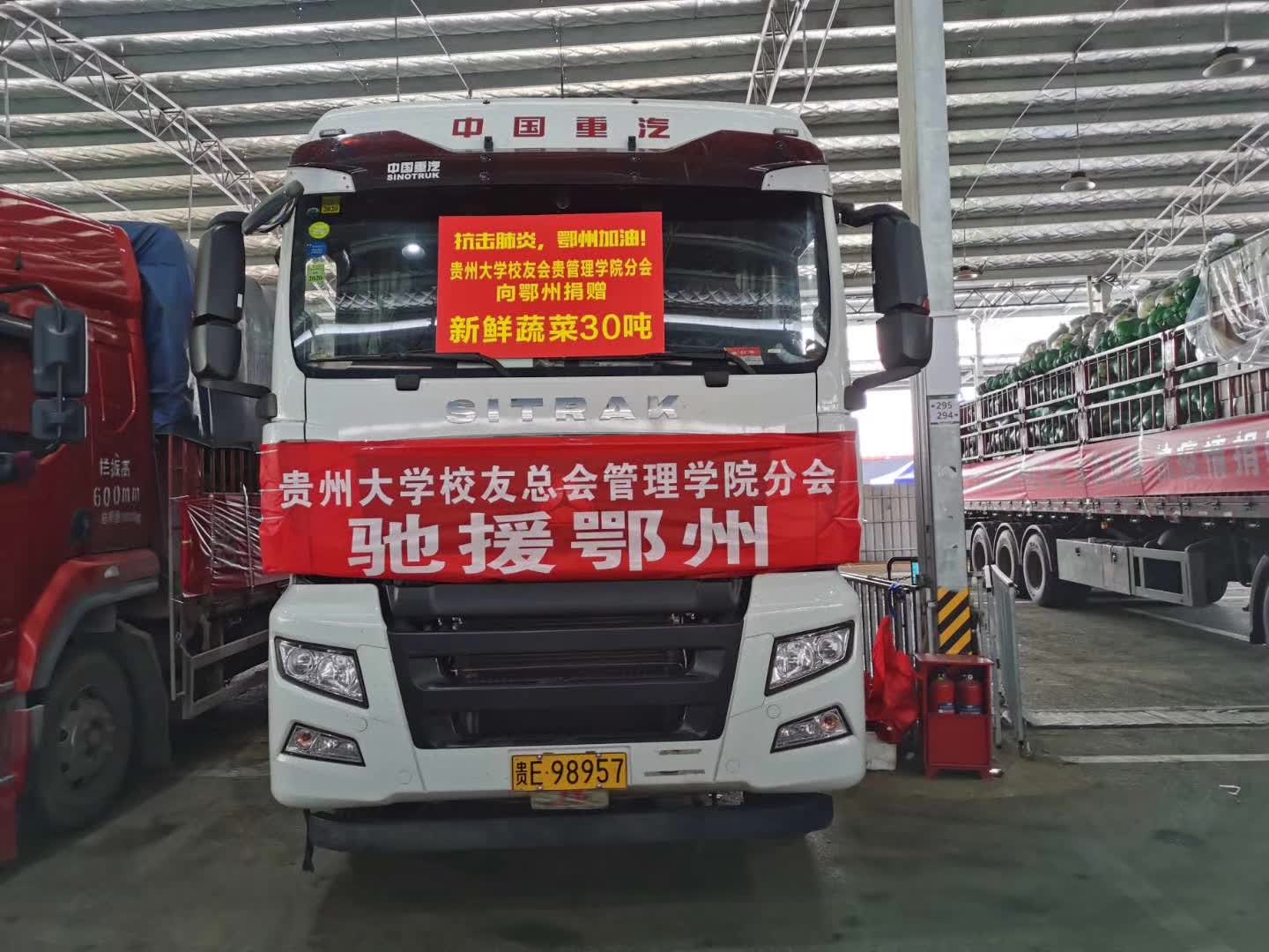 “同心同行,保家卫国抗役情”。湖北鄂州是贵州省定点支援的疫情地区。2020年2月13日下午三点,在贵阳市委统战部的组织下,捐赠发车仪式在贵阳市扎佐物流园进行,贵州大学校友总会管理学院分会带领校友企业,并联合厦门大学EMBA校友会、贵州石材协会积极响应号召,为湖北鄂州捐赠160吨新鲜蔬菜,价值34.46万元,尽校友们的绵薄之力,全力支年持湖北省鄂州市,一同共渡难关。校友企业 贵州长通集团、贵州楚天两江环境股份有限公司分别以公司的名义捐赠一车蔬菜。