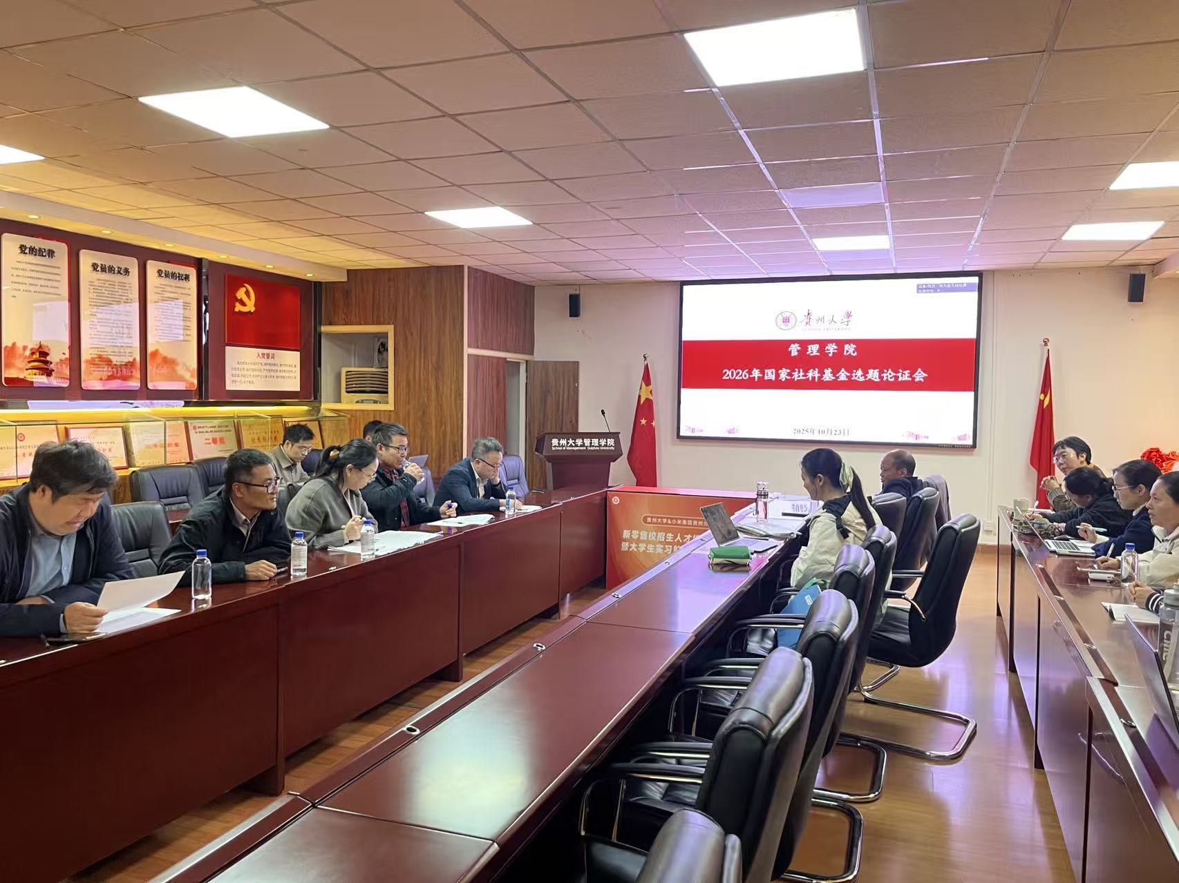 为扎实推进2026年度国家社科基金项目申报工作,提前谋划、精准培育高水平选题,10月23日下午3时,管理学院在学院陈列室成功召开了2026年国家社科基金选题论证会。论证会由学院副院长许为宾主持。