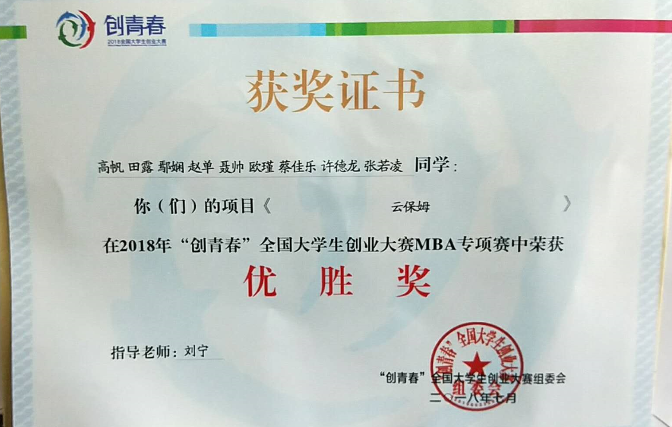 贵州大学管理学院MBA同学的项目——“云保姆”项目,成功进入最终决赛。于2018年7月13日在浙江师范大学进行决赛,全国入选项目200个,其中MBA专项赛100个,网络经济项目100个。经过三天的角逐,我院“云保姆”项目获得优秀奖。从备赛到网报、网选,最终进入全国总决赛,师生的辛勤付出,终有收获。