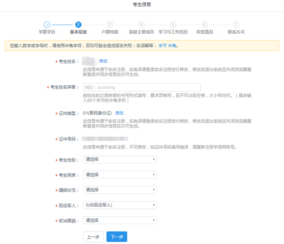 2.顺次填写学籍学历→基本信息→户籍档案→家庭主要成员→学习与工作经历→奖惩情况→联系方式