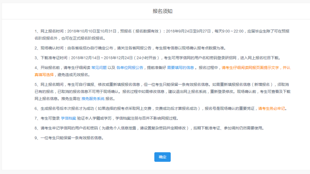 5.现场确认时间在2018年11月10日之前,具体安排请查看各省级招办发布的网报公告http://yz.chsi.com.cn/sswbgg/