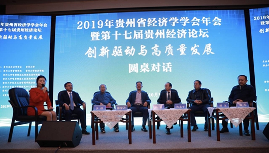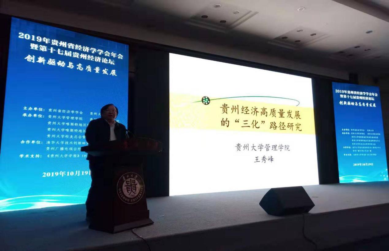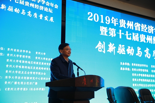 为实现贵州省经济创新驱动与高质量发展,10月19日上午,2019年贵州省经济学学会年会暨第十七届贵州经济论坛在贵大东校区一号行政楼学术报告厅举行。会议由贵州省经济学学会与我校联合主办,由我校管理学院、经济学院、喀斯特地区创新发展研究院、喀斯特地区发展战略研究中心以及校友会总会管理学院分会联合承办。本次会议由贵州经济广播主持人思苇主持。出席本次年会的领导与嘉宾有贵州省政协原副主席班程农、清华大学教授陈劲、贵州省经济学学会会长申振东教授、台湾大学商学研究所陈家声教授、贵州省政府发展研究中心原主任王礼全研究员、黔南州政协主席魏明禄博士、贵州财经大学副校长杨勇教授、贵州大学原党委副书记冯晓宪教授、贵州财经大学原副校长张晓阳教授、贵州大学副校长向淑文教授以及管理学院党委书记王秀峰教授与院长李烨教授、副院长周莉莉教授、宋山梅教授以及企业家代表贵州正业国际工程企业管理集团有限公司董事长沈志平、贵州楚天两江环境股份有限公司董事长胡文、贵州国际酒类博览会股份有限公司董事长戴军等。