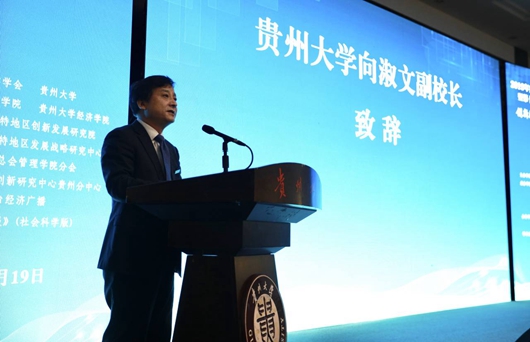 会议伊始,班程农副主席、申振东会长以及向淑文副校长分别致辞。班主席从“为什么要创新驱动高质量发展?”“靠什么创新驱动高质量发展?”“怎样去创新驱动高质量发展?”三方面解读了贵州省经济创新驱动与高质量发展的原因、方式及途经。他表示,“面壁十年图破壁,难酬涛海亦英雄”,他勉励专家学者咬定目标,坚定不移,助推贵州省经济创新驱动与高质量发展。