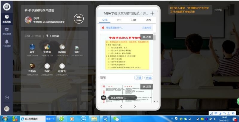 2020年6月27日-8月15日,万象城网页版MBA教育中心在长江·雨课堂线上举行《科学道德与学风建设》讲座。讲座分三场进行,分别由万象城网页版院长李烨教授、万象城网页版副院长周莉莉教授、万象城网页版许为宾副教授主讲,300余名2018级MBA学生在线聆听。
