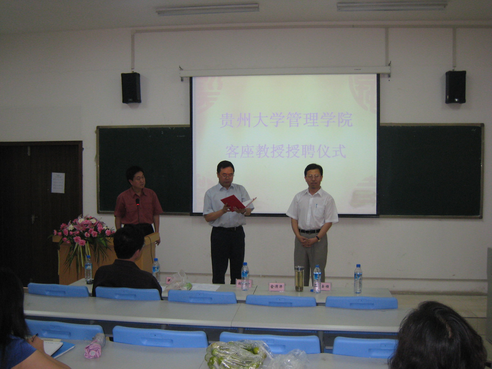 开班仪式后,还举行了“金泽华客座教授聘任仪式”,贵州大学常务副校长兼研究生院院长封孝伦教授为我校新聘任的客座教授金泽华颁发了贵州大学客座教授聘任证书,接着金泽华教授为MBA学员做了题为《乌江水电开发战略与持续发展》的精彩讲座。