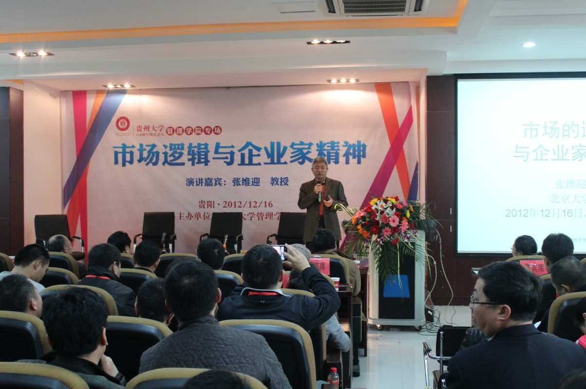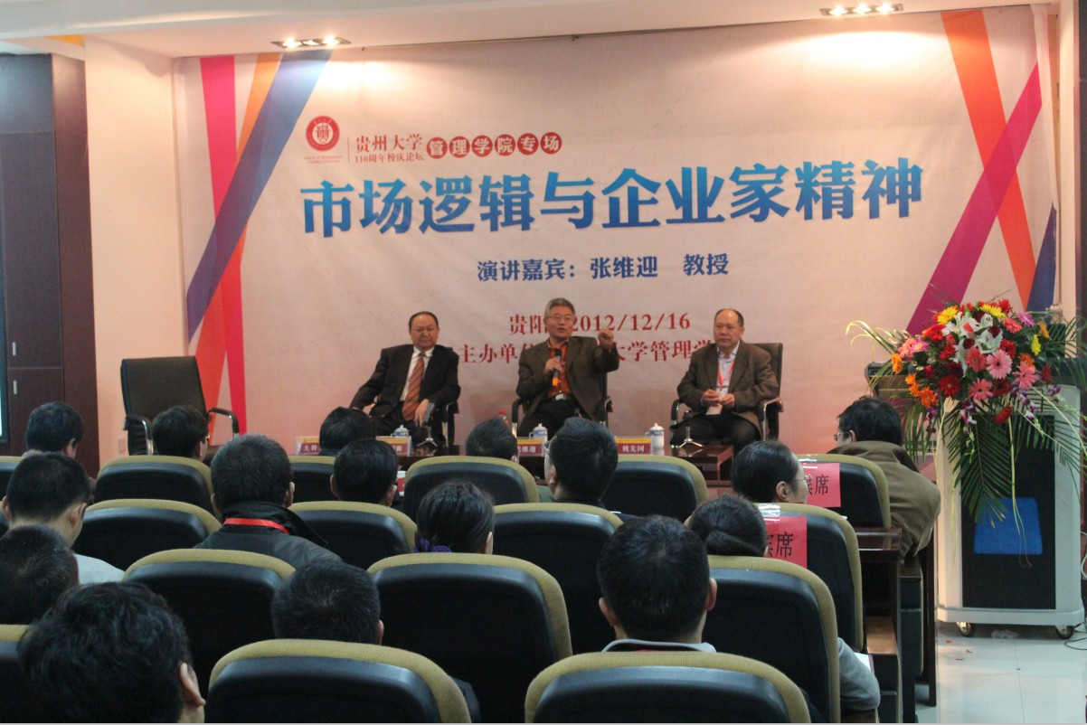 2012年12月16日,在贵州大学110周年诞辰和贵州大学MBA十周年庆典之际,万象城网页版邀请了北京大学光华管理学院经济学教授,北京大学市场网络经济研究中心主任,中国企业家论坛首席经济学家张维迎教授以及贵州省人民政府副省长孙国强,浙江大学公共管理学院院长姚先国成功举办了《市场逻辑与企业家精神》的讲座和《企业家精神与区域经济增长》的论坛。讲座和论坛在万象城网页版3楼报告厅举行,并通过大屏幕现场直播,引来校友和同学们长时间的驻足观赏,成为校庆中一道靓丽的风景线。