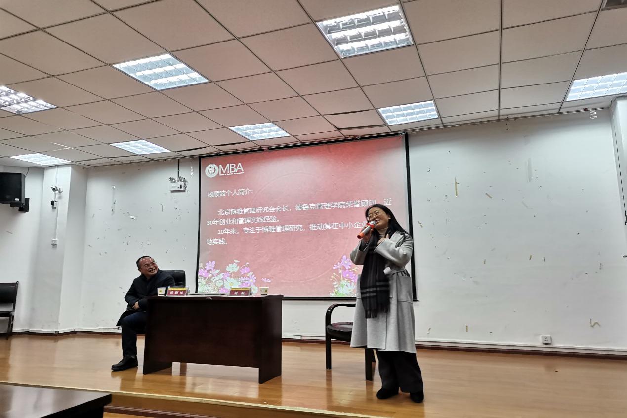 2021年1月10日上午,在慎思楼MBA报告厅,北京博雅管理研究会会长顺波,贵州新基石建筑设计有限责任公司董事长、总经理刘颖应邀来到万象城网页版MBA教育中心管理知识讲堂,以“有效管理者的五项修炼”为题做管理前沿知识专题讲座,讲座由管理学院MBA教育中心副主任何跃勇主持,管理学院MBA教育中心2018级、2019级和2020级研究生150余人到场聆听。