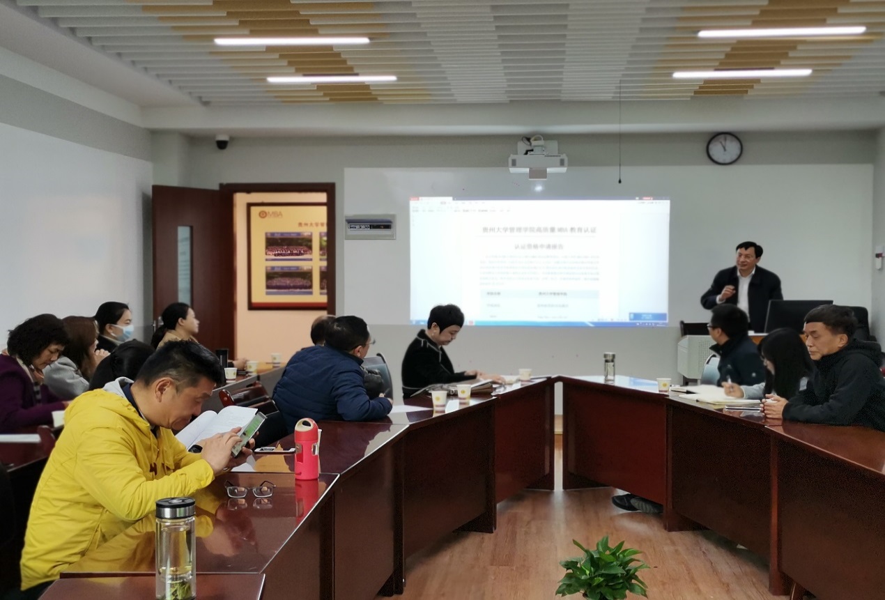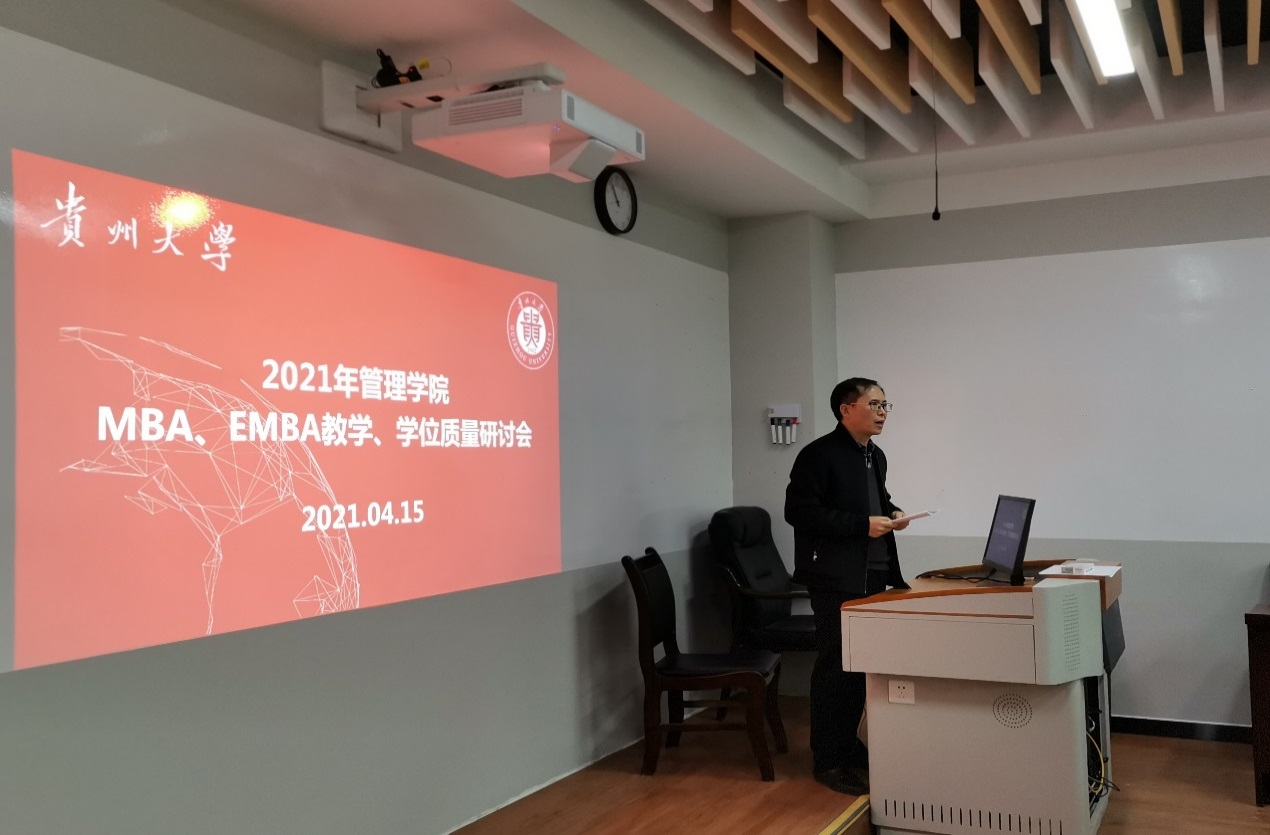 2021年4月15日上午,万象城网页版MBA教育中心在202教室举行“2021年管理学院MBA、EMBA教学及学位质量研讨会”。贵州大学研究生院院长杜滨教授、管理学院副院长周莉莉教授、30余位MBA中心任课老师及研究生导师、MBA中心主任项凯标教授、EMBA中心主任李雨峰老师、MBA中心副主任何跃勇老师、MBA中心办公室主任邓琳老师以及中心工作人员共40余位人参加了此次研讨会。研讨会由副院长周莉莉教授主持。