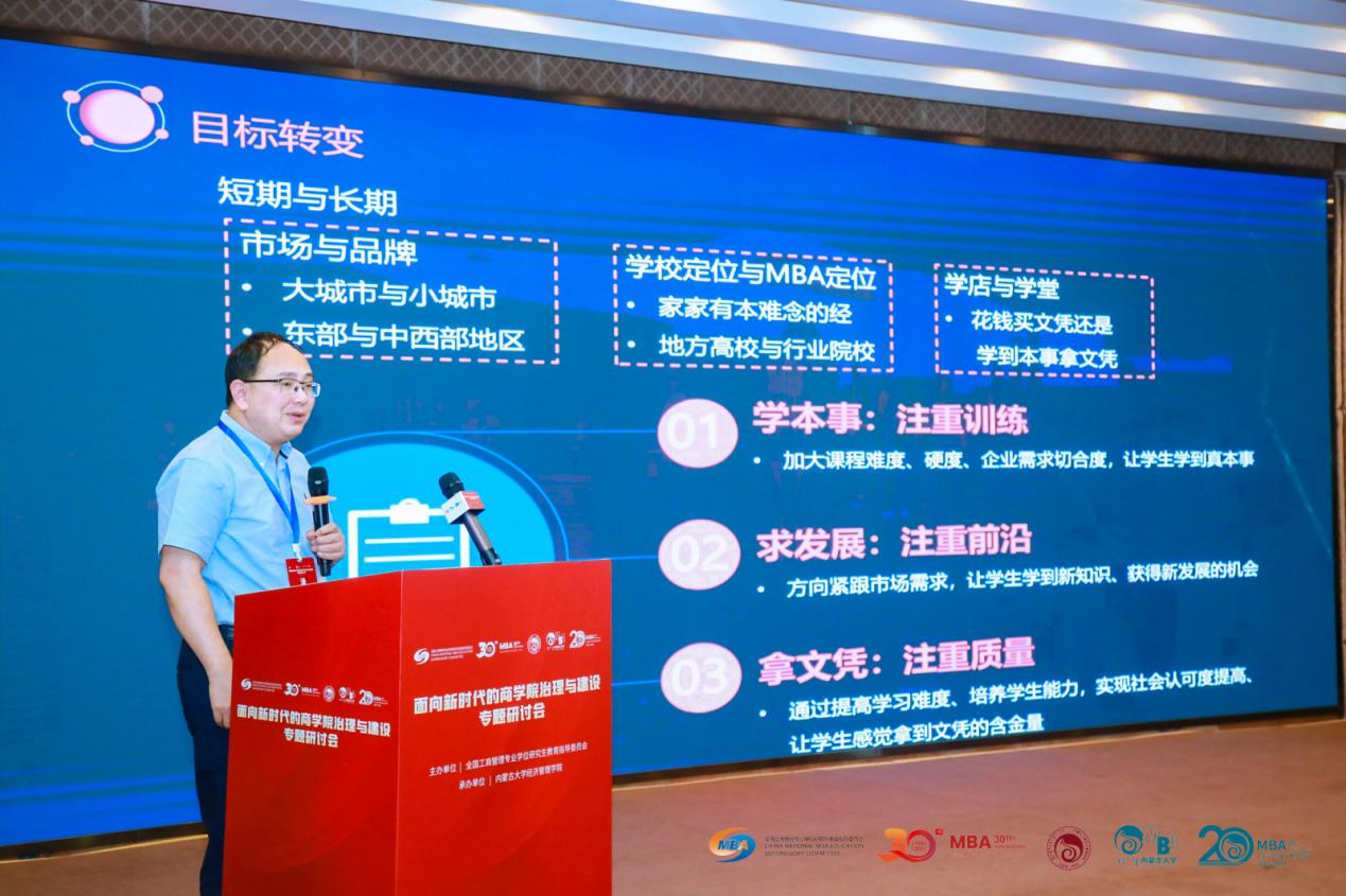 2021年7月29日,由全国工商管理专业学位研究生教育指导委员会(以下简称“全国MBA教指委”)主办,内蒙古大学经济管理学院承办的“面向新时代的商学院治理与建设”专题研讨会在呼和浩特市成功举办。万象城网页版副院长周莉莉教授和MBA教育中心副主任何跃勇老师参加了此次研讨会。