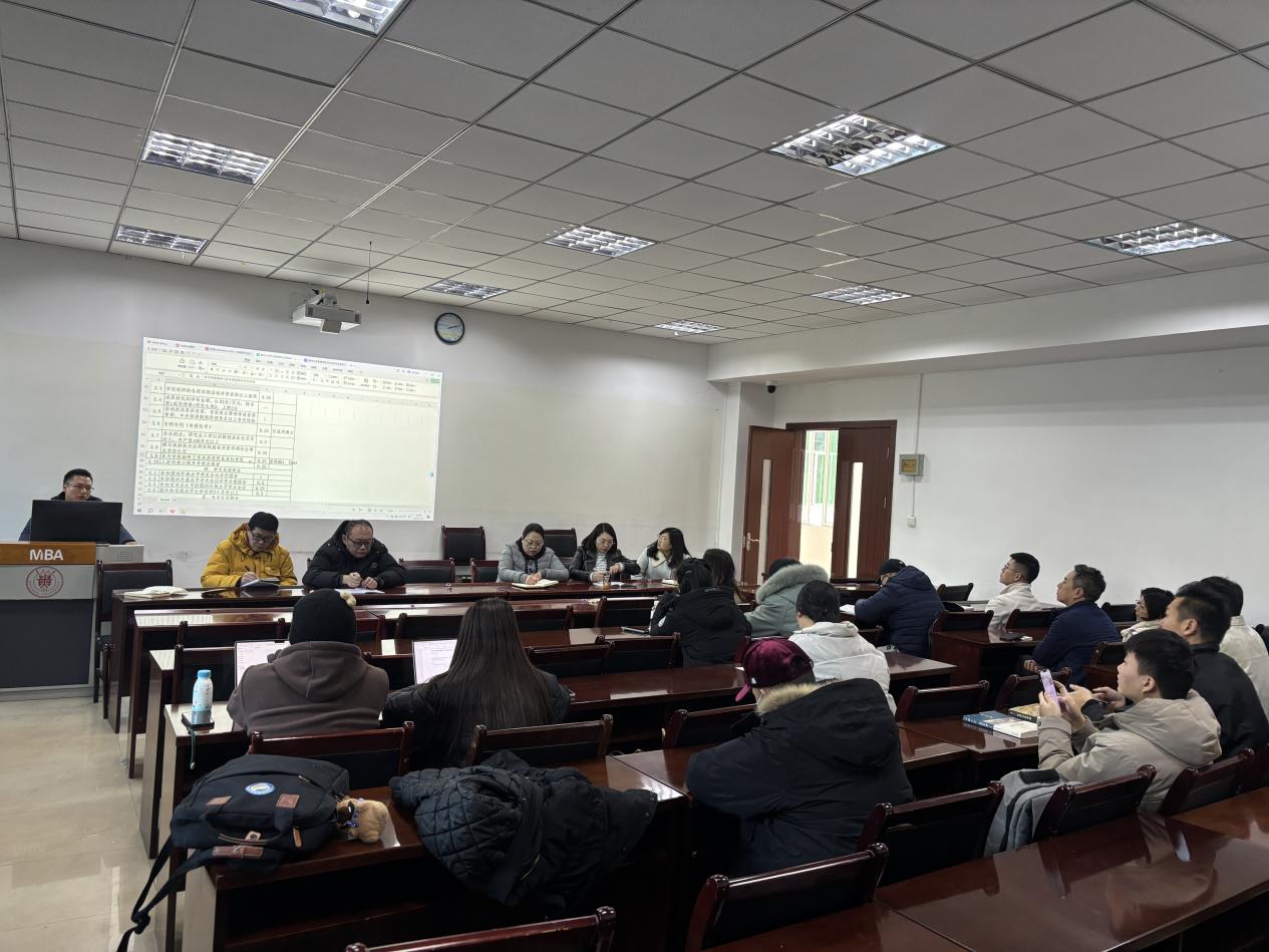 会议开始,何主任向大家介绍了MBA教育中心各老师的职责和分管情况,通报各年级下学期的工作计划与教学安排,并重点对22级盲评及毕业答辩、23级论文开题及答辩、24级选修课安排及论文写作方向等事项进行了详细讲解。